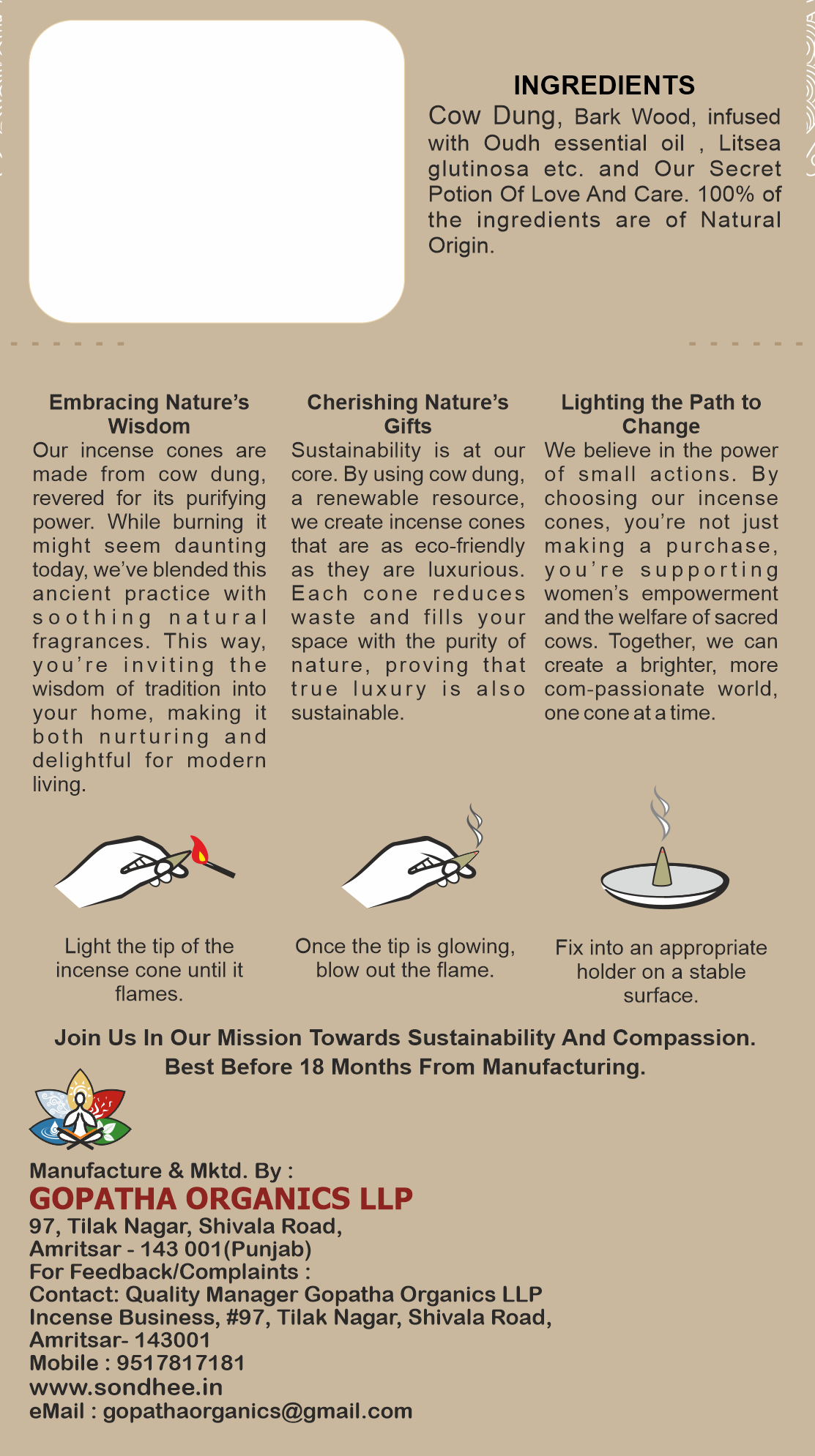SONDHEE Oud Dhoop Cones are thoughtfully handcrafted using purified cow dung—revered in Indian tradition for its cleansing and sattvic qualities—blended with carefully selected oud-inspired fragrance oils. This powerful combination creates a deeply grounding and spiritually uplifting aromatic experience rooted in ancient wisdom yet suited for modern living.
